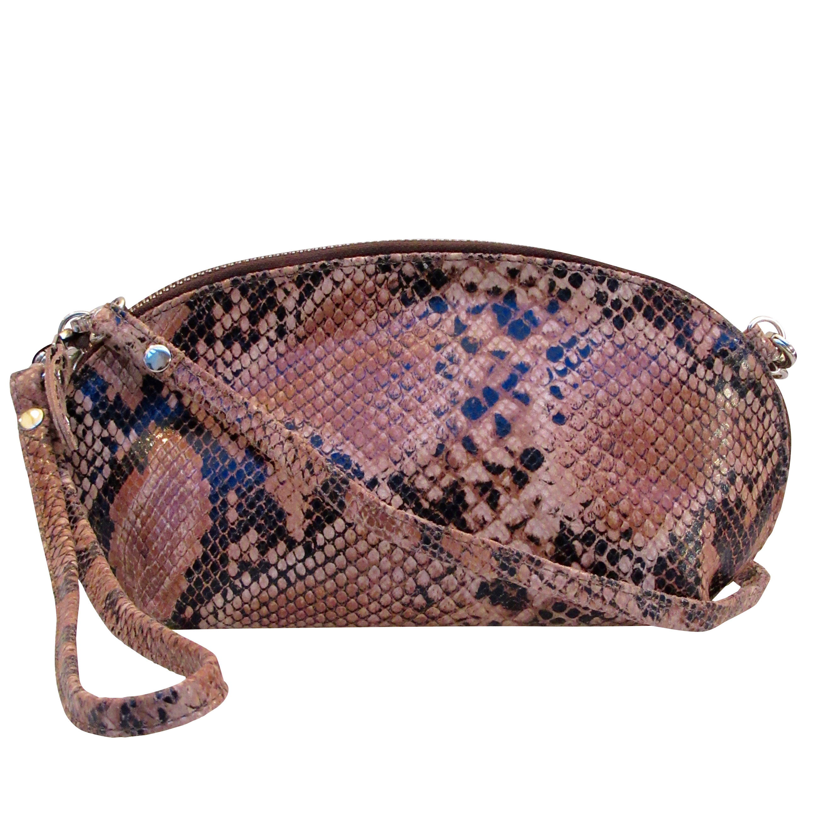 Super lækker lædertaske fra Tim & Simonsen. Lædertasken er i et trendy slangeskinds-look i brunelige nuancer. Tasken er funktionel og kan både anvendes som clutch og crossover-bag da der medfølger en lang aftagelig rem. Der medfølger også en kortere rem, hvis du heller vil benytte tasken på den måde.